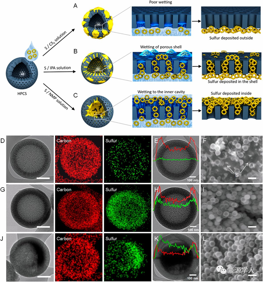 圖1(A-C)比較三種不同硫溶解溶液滲透到HPCS中的示意圖。(D,G,J)高倍TEM圖像;(E,H,K)S/HPCS(CS2),(H)S/HPCS(CS2/IPA)和(K)S/HPCS(CS2/NMP)的高倍TEM圖像和線EDX結果;(F,I和L)S/HPCS(CS2),(I)S/HPCS(CS2/IPA)和(L)S/HPCS(CS2/NMP)的低倍SEM圖像。