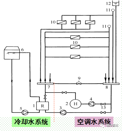 1-水冷冷水機組 ;2-鍋爐 ;3-冷凍水泵 ;4-熱水泵 ;5-冷卻水泵 ;6-冷卻塔 ;7-分水器;8-集水器 ;9-壓差控制閥 ;10-空調設備 ;11-自動排氣閥 ;12-膨脹水箱 ;13-閥門