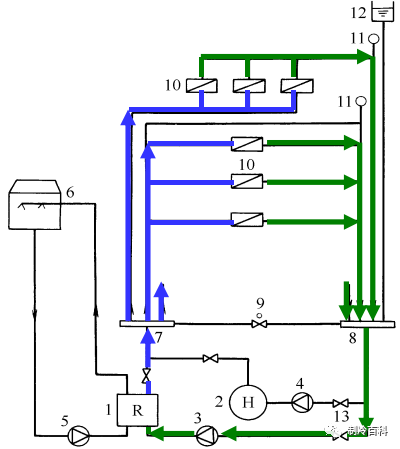 夏季供冷時 :下圖所示,冷水機組1制出的7℃冷凍水,在冷凍水泵3的作用下送至分水器7,然后由分水器通過各供水支管分別送至各空調房間或區域的空調設備10
