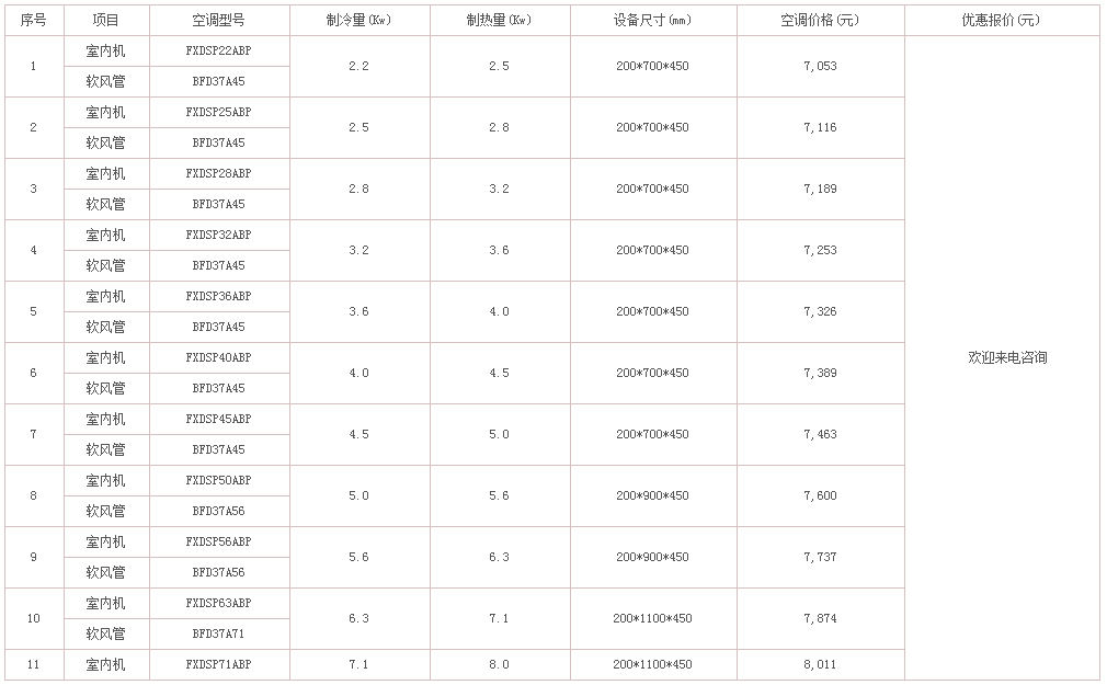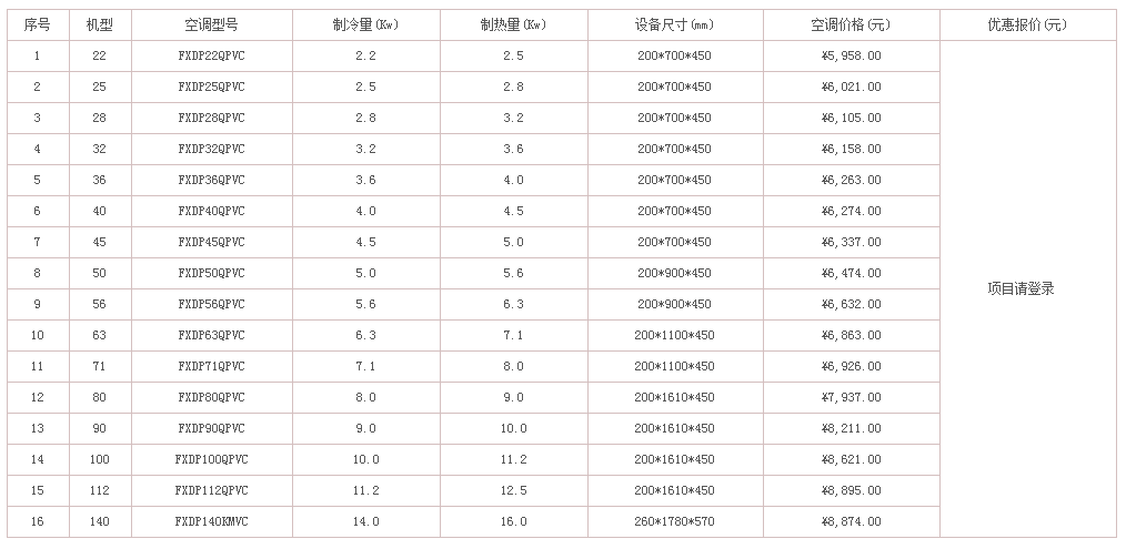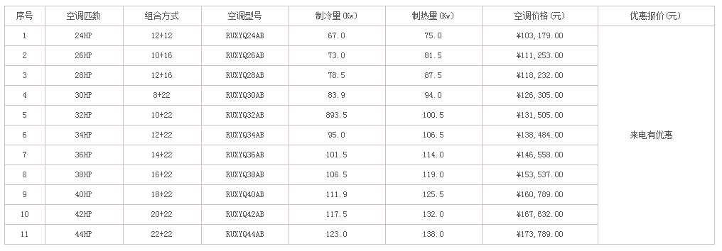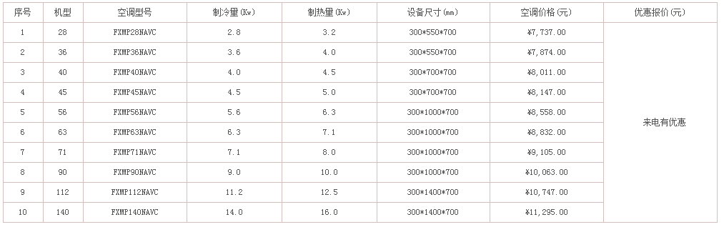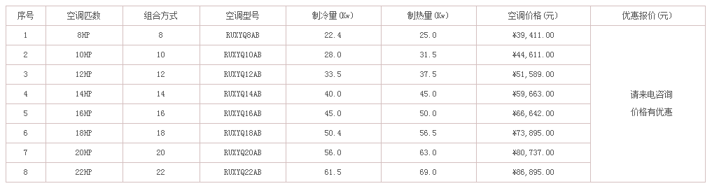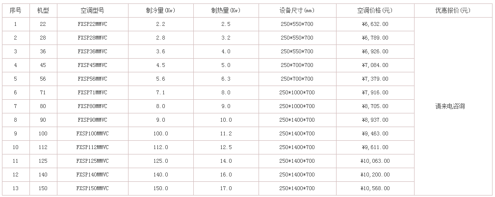 惠馳空調(diào)電器作為大金空調(diào)的經(jīng)銷商,有能力也有義務(wù)為大家解決這個(gè)急切的問題。下面列出了不同類型和不同型號(hào)的大金中央空調(diào)的價(jià)格,有需要的可以聯(lián)系惠馳空調(diào),隨時(shí)為您解答。