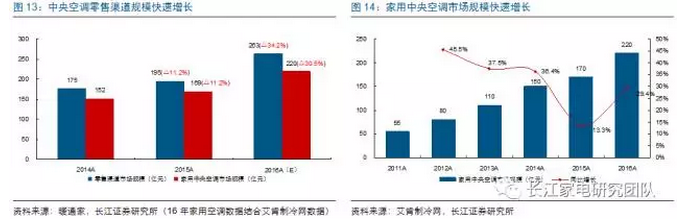 多聯(lián)機(jī)市場得以逐漸擺脫地產(chǎn)束縛實(shí)現(xiàn)高速增長的核心主因在于其零售渠道方面的良好表現(xiàn),而帶動零售渠道需求釋放的主因一方面在于供給端中央空調(diào)廠商持續(xù)的終端零售渠道建設(shè)投入,另一方面也是最重要的,我們認(rèn)為是需求端家用中央空調(diào)消費(fèi)的逐步崛起;目前家用中央空調(diào)總體市場規(guī)模或已超過中央空調(diào)市場總?cè)萘康娜种唬沂袌鋈耘f持續(xù)超過兩位數(shù)的高速增長,隨著高增長的家用部分在中央空調(diào)市場整體份額中權(quán)重不斷提升,其有望驅(qū)動中央空調(diào)行業(yè)重歸正成長。