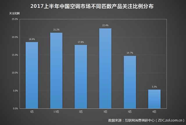 2017年上半年中國空調(diào)市場不同匹數(shù)產(chǎn)品關(guān)注比例分布