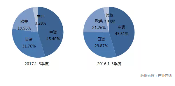 據(jù)產(chǎn)業(yè)在線統(tǒng)計(jì)數(shù)據(jù),從整體市場占有率來看,今年前三季度,中資、日資和歐美企業(yè)的市場占比分別為45.40%、31.76%和19.56%,相較于去年,中資和日資企業(yè)的市場占有率同比增長分別為0.08%和1.89%,而歐美企業(yè)占比則下滑1.7%。