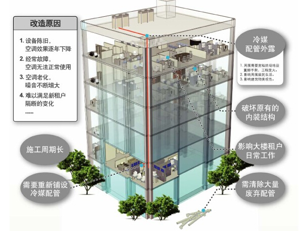 隨著空調(diào)使用年限的增加,很多產(chǎn)品運(yùn)行至今已經(jīng)接近10年。空調(diào)問(wèn)題開(kāi)始凸顯,比如故障率頻發(fā)、小毛病不斷、壓縮機(jī)燒機(jī)率增高、維保費(fèi)用逐漸增加、耗能?chē)?yán)重、空調(diào)負(fù)荷無(wú)法滿足人們需要等,很多用戶(hù)亟待進(jìn)行改造。