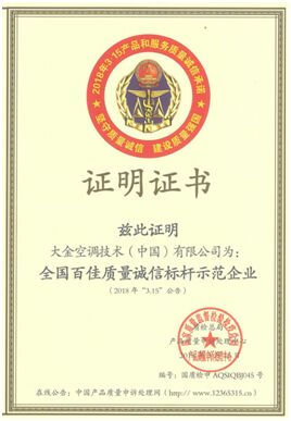 近日,國(guó)家質(zhì)量監(jiān)督檢驗(yàn)檢疫總局產(chǎn)品質(zhì)量申訴處理中心向大金空調(diào)頒發(fā)了“全國(guó)百佳質(zhì)量誠(chéng)信標(biāo)桿示范企業(yè)”證書(shū),旨為彰顯質(zhì)量誠(chéng)信標(biāo)桿企業(yè)的引領(lǐng)作用,增強(qiáng)全社會(huì)的質(zhì)量誠(chéng)信意識(shí),引導(dǎo)全社會(huì)積極響應(yīng)“中國(guó)制造2025”戰(zhàn)略。在全國(guó)各行業(yè)內(nèi)審核確認(rèn)“全國(guó)百佳質(zhì)量誠(chéng)信標(biāo)桿示范企業(yè)”,大金空調(diào)為今年全國(guó)范圍內(nèi)的百家獲獎(jiǎng)企業(yè)之一。